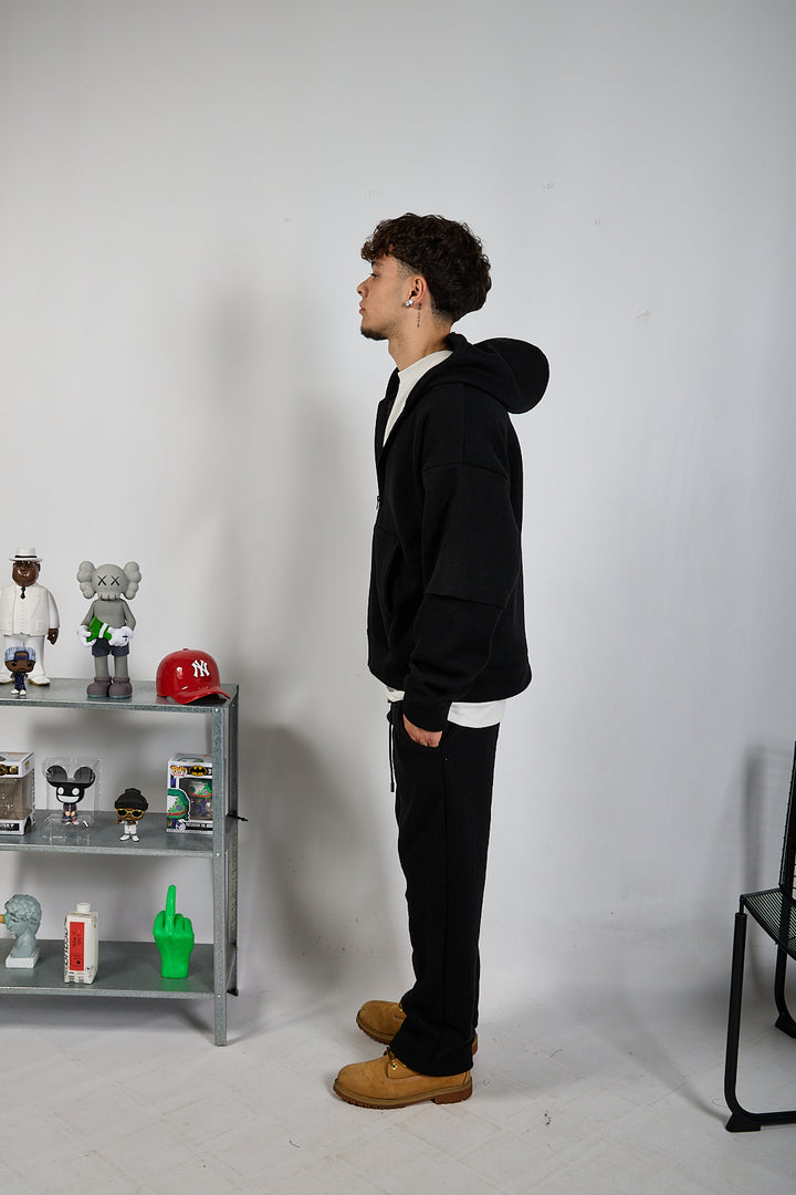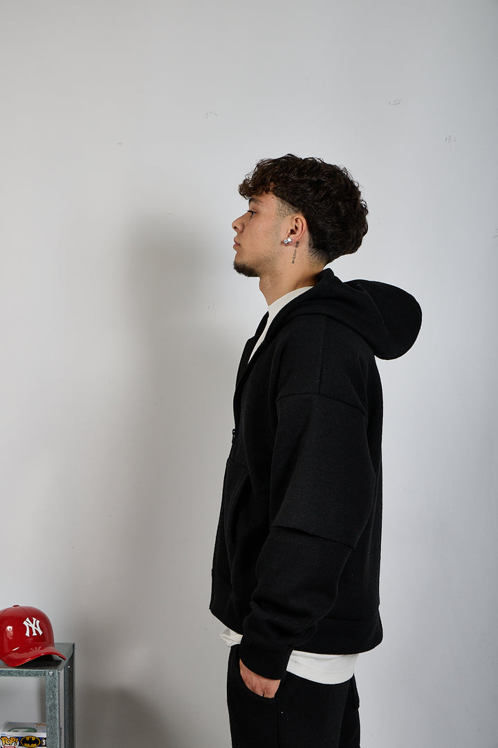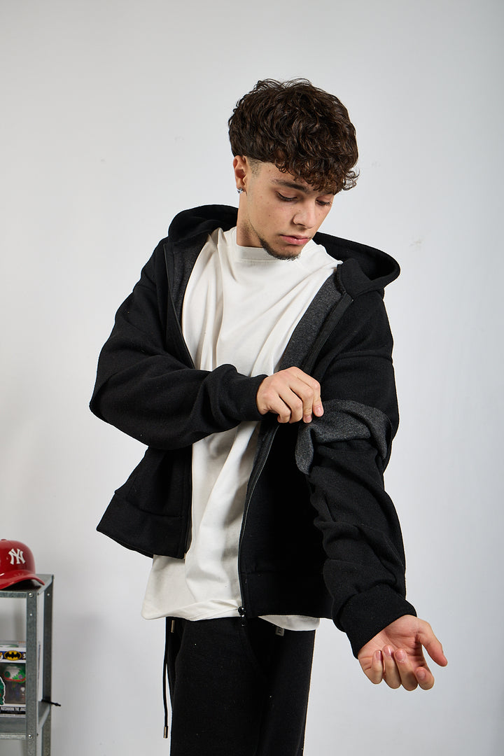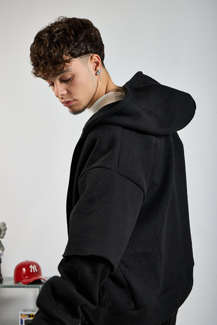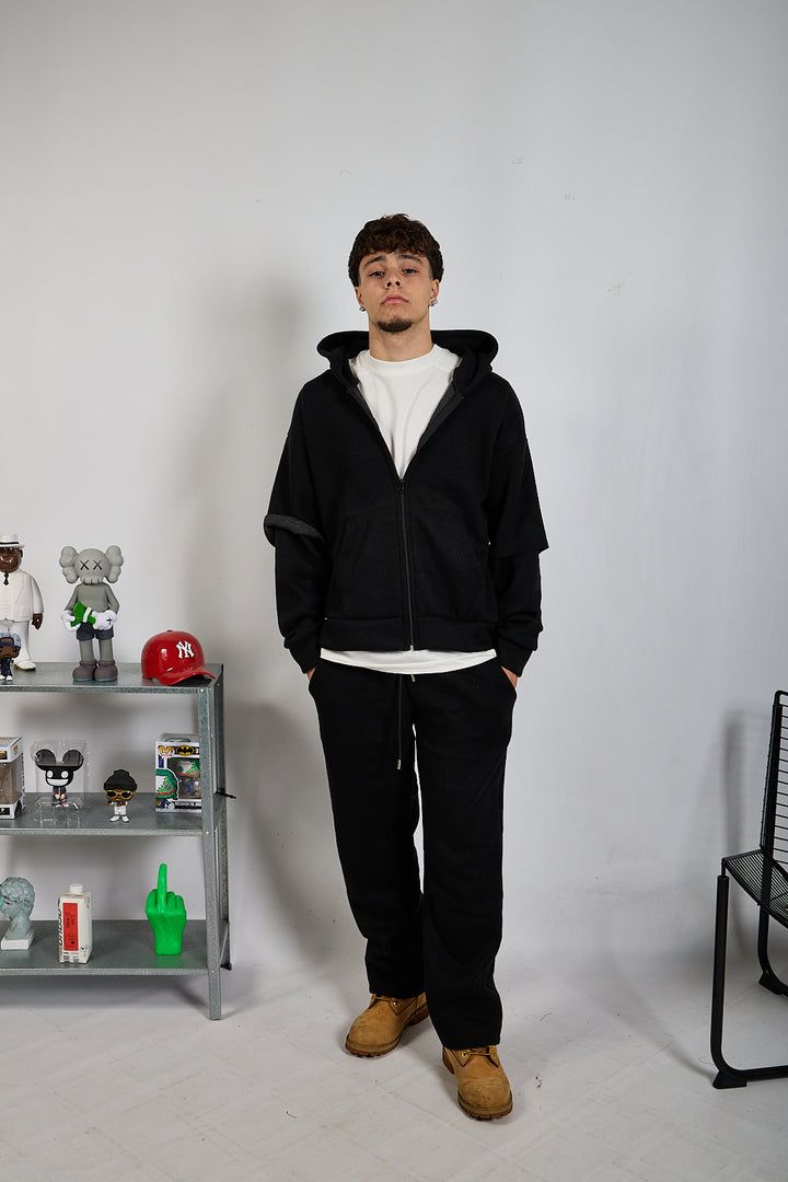 Condonato in lana-canapa composto da felpa con zip doppiata con doppie maniche e pantalone fondo ampio.