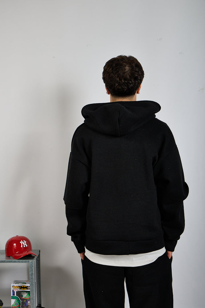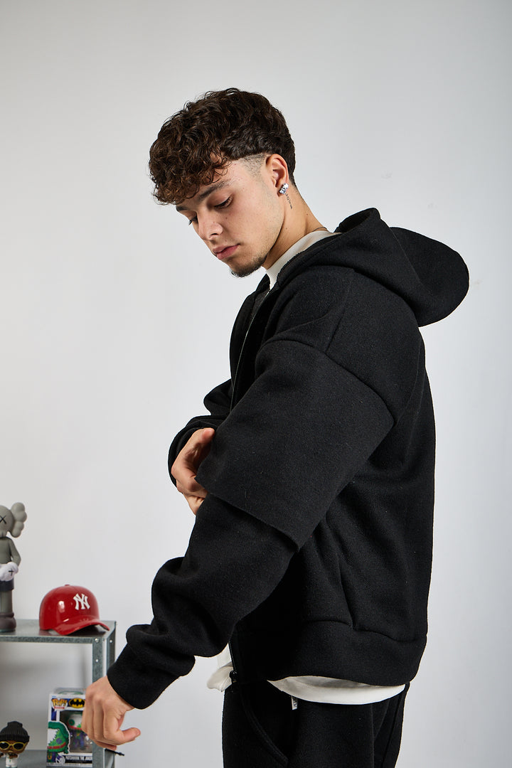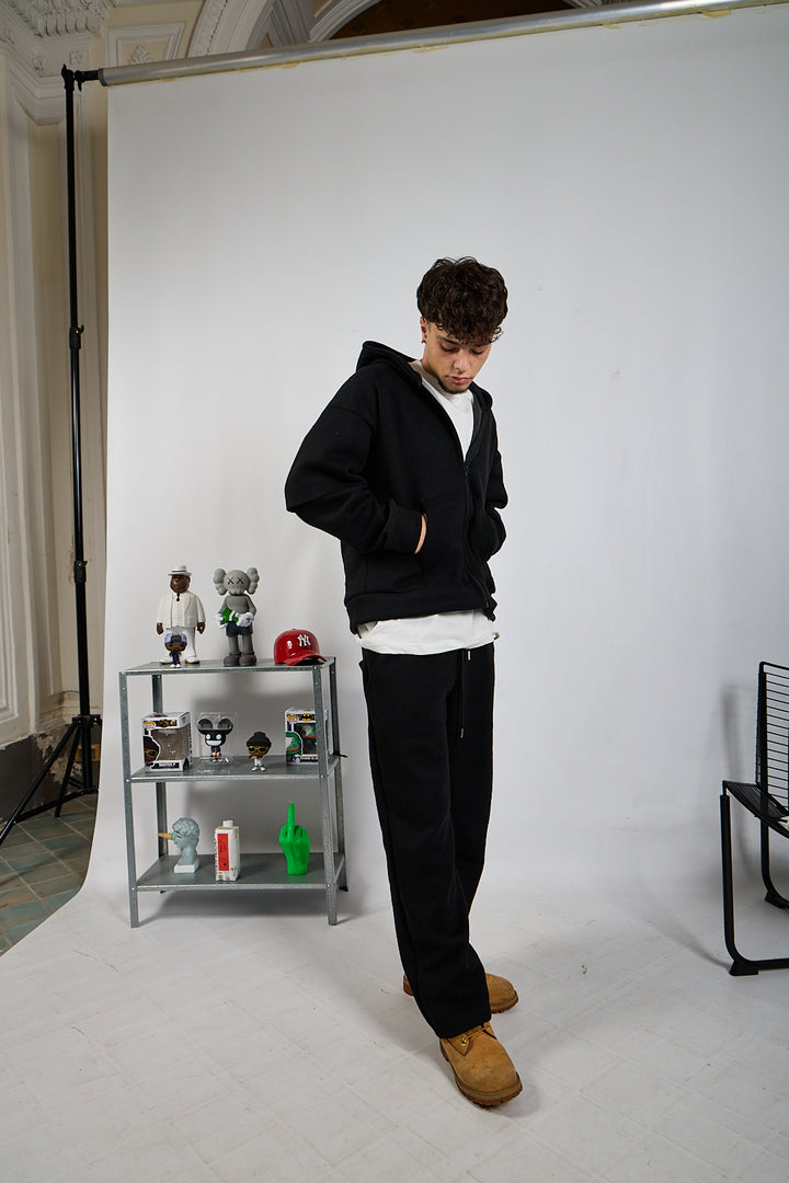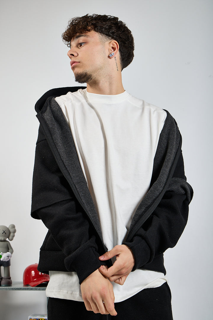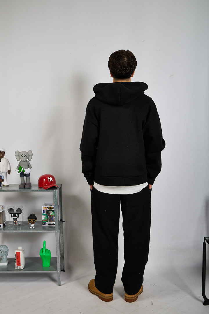 Condonato in lana-canapa composto da felpa con zip doppiata con doppie maniche e pantalone fondo ampio.