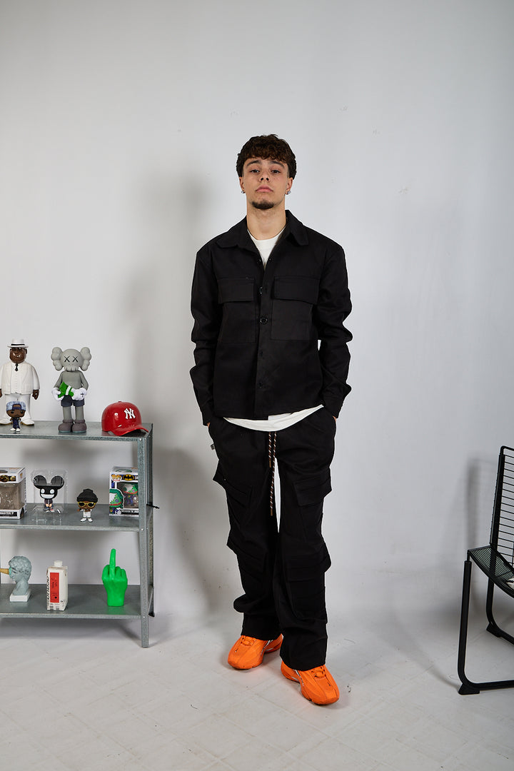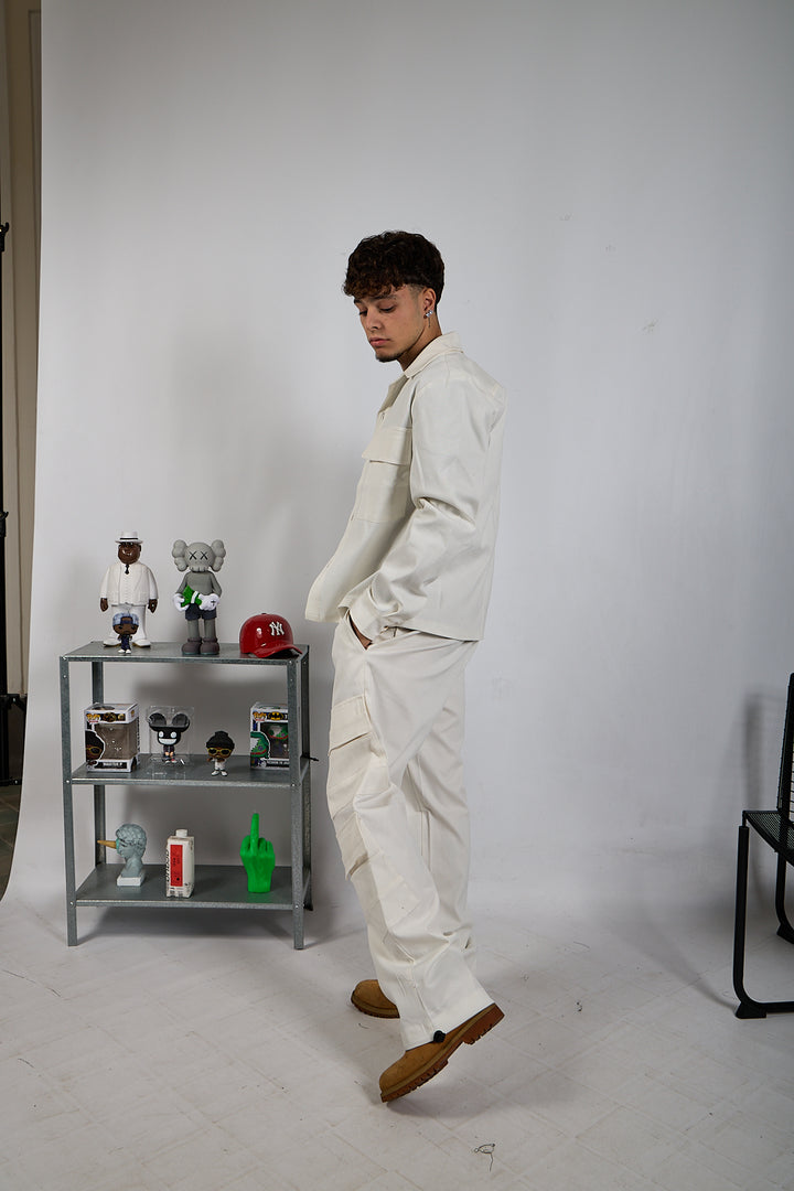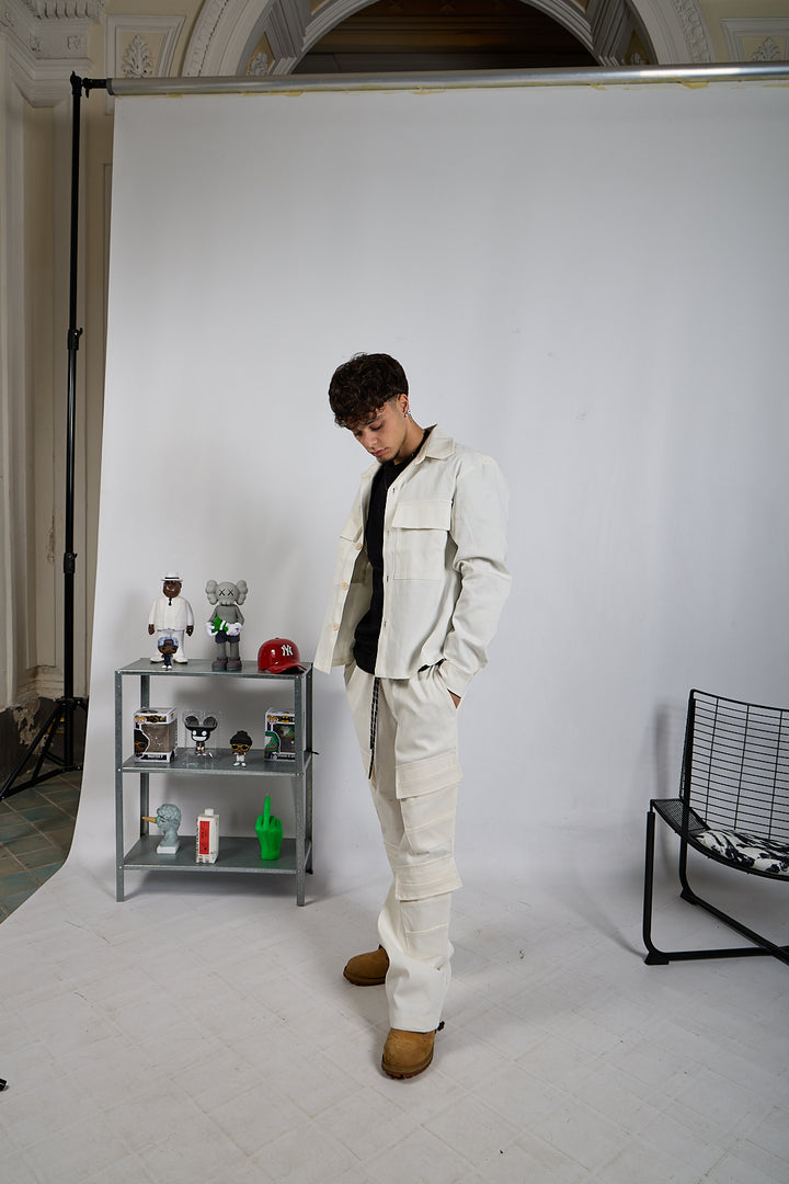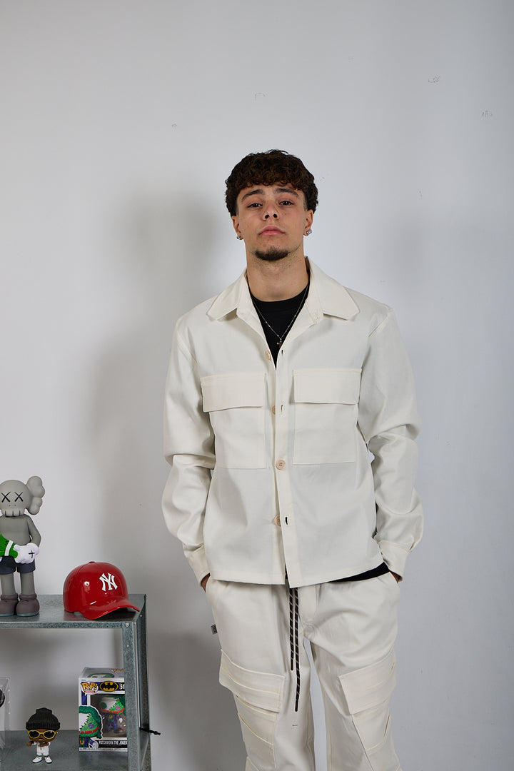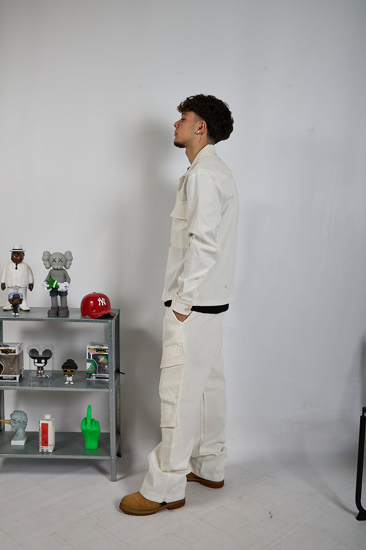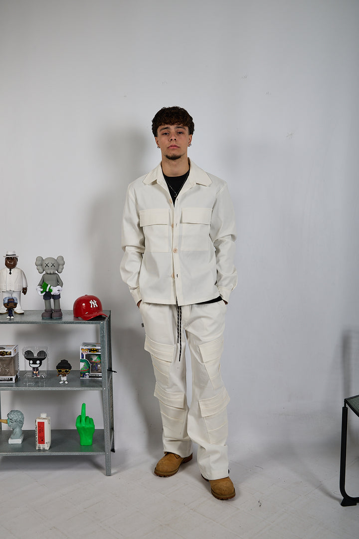 Cordinato in tessuto gabardina del brand fear of love composto da camicia jacket e cargo pant